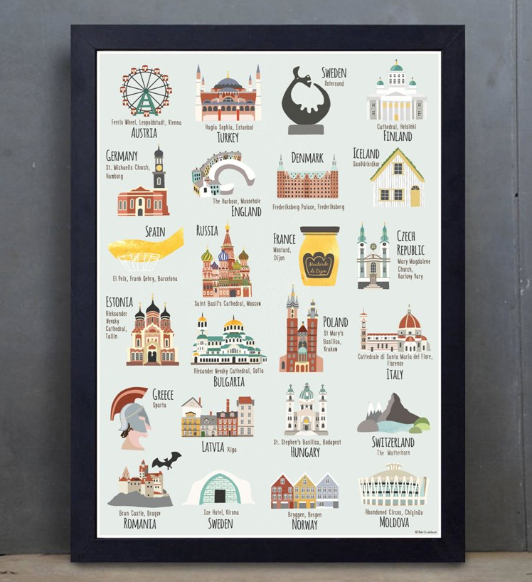 A hand drawn, charming illustrated European Famous Places poster based on my popular Illustrated Map of Europe & the Mediterranean.
